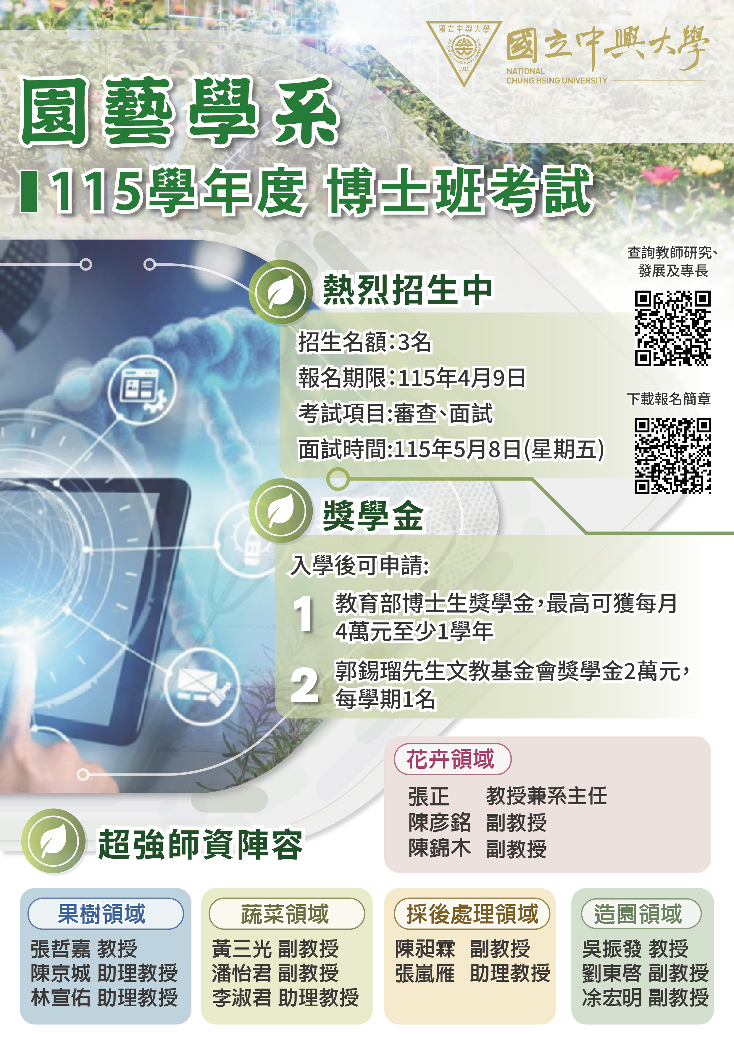 本系博士班考試現正受理報名,入學後博士生可申請多項獎助學金,包含: