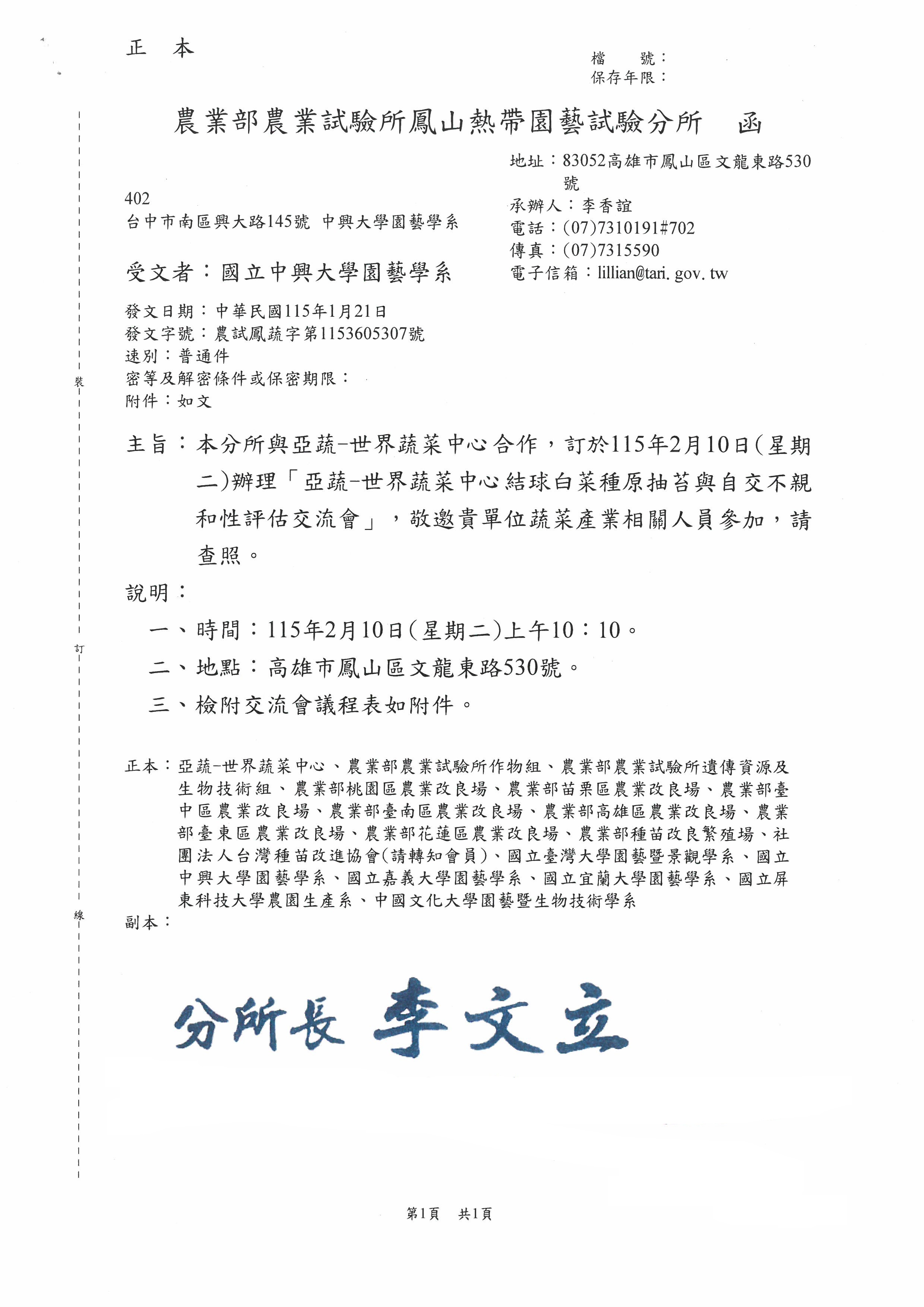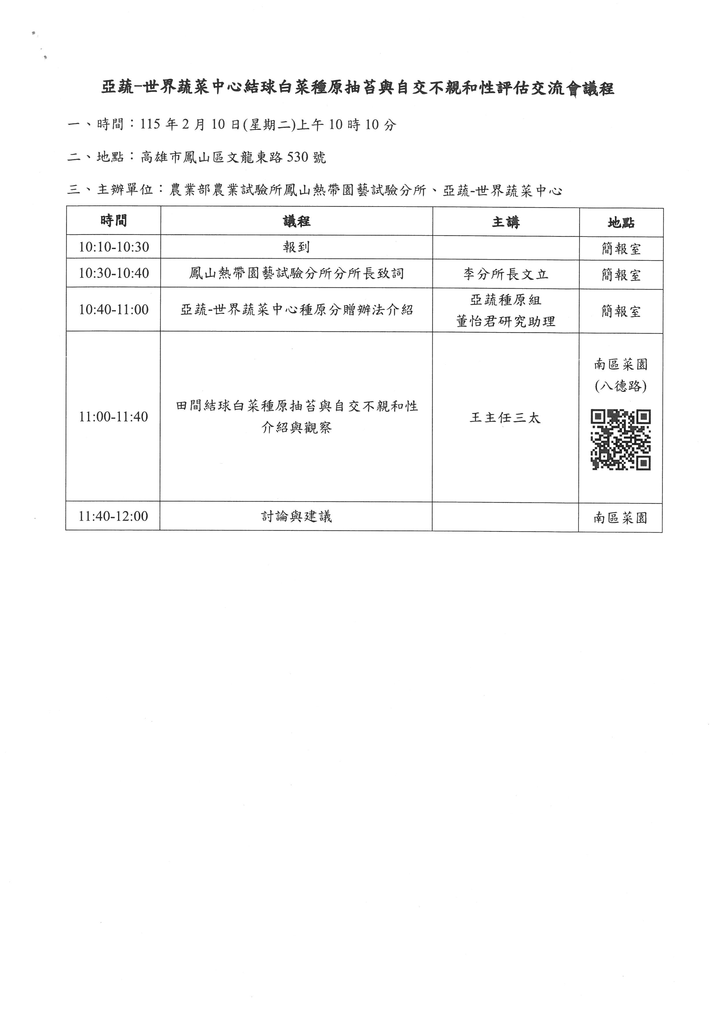 有關115年2月10日亞蔬-世界蔬菜中心結球白菜種原抽苔與自膠布親和性評估交流會,詳如下表,
