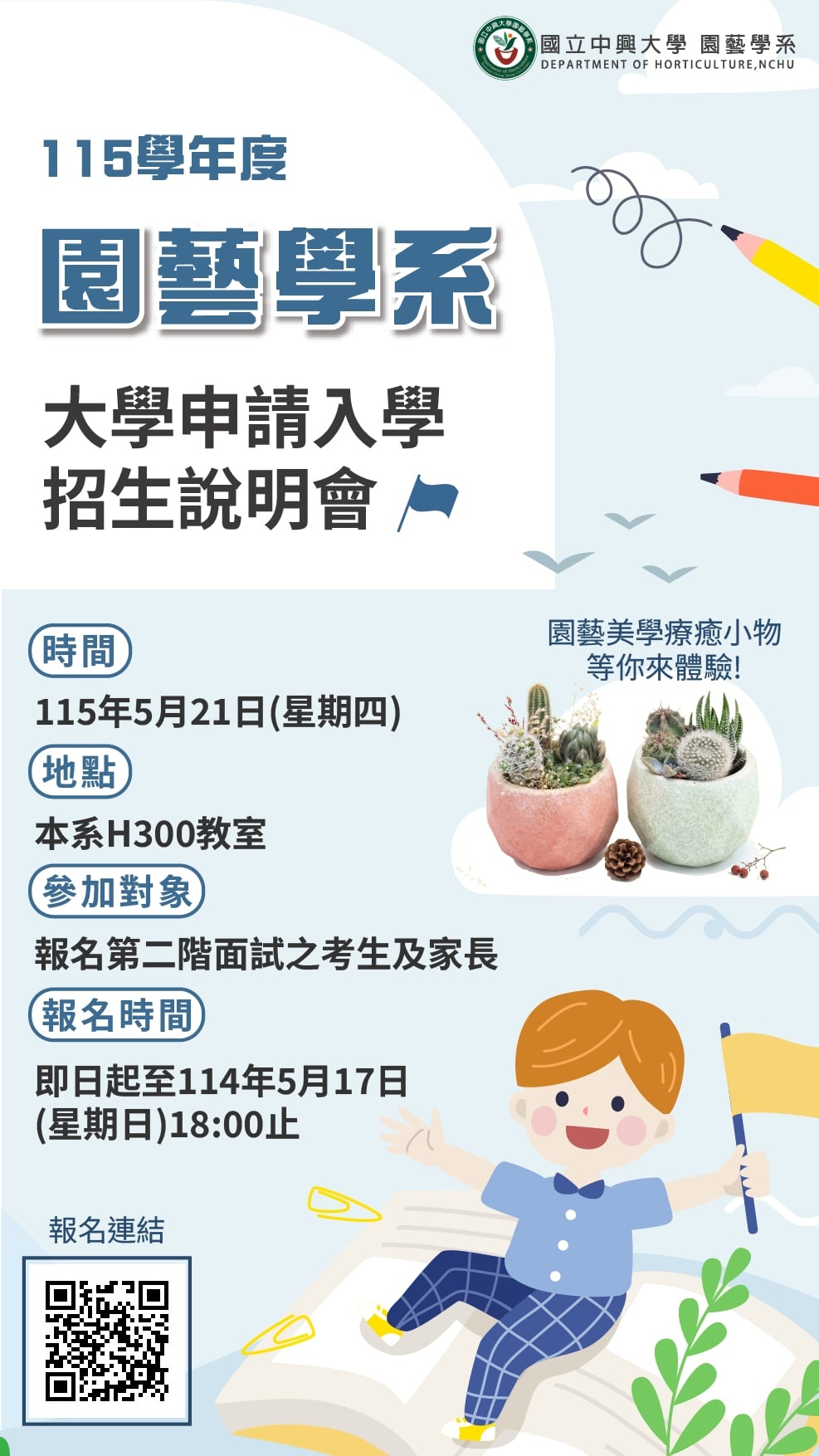 同時歡迎大家選擇中興大學園藝學系,作為大學旅程的起點,開啟精彩豐富的園藝生涯。
